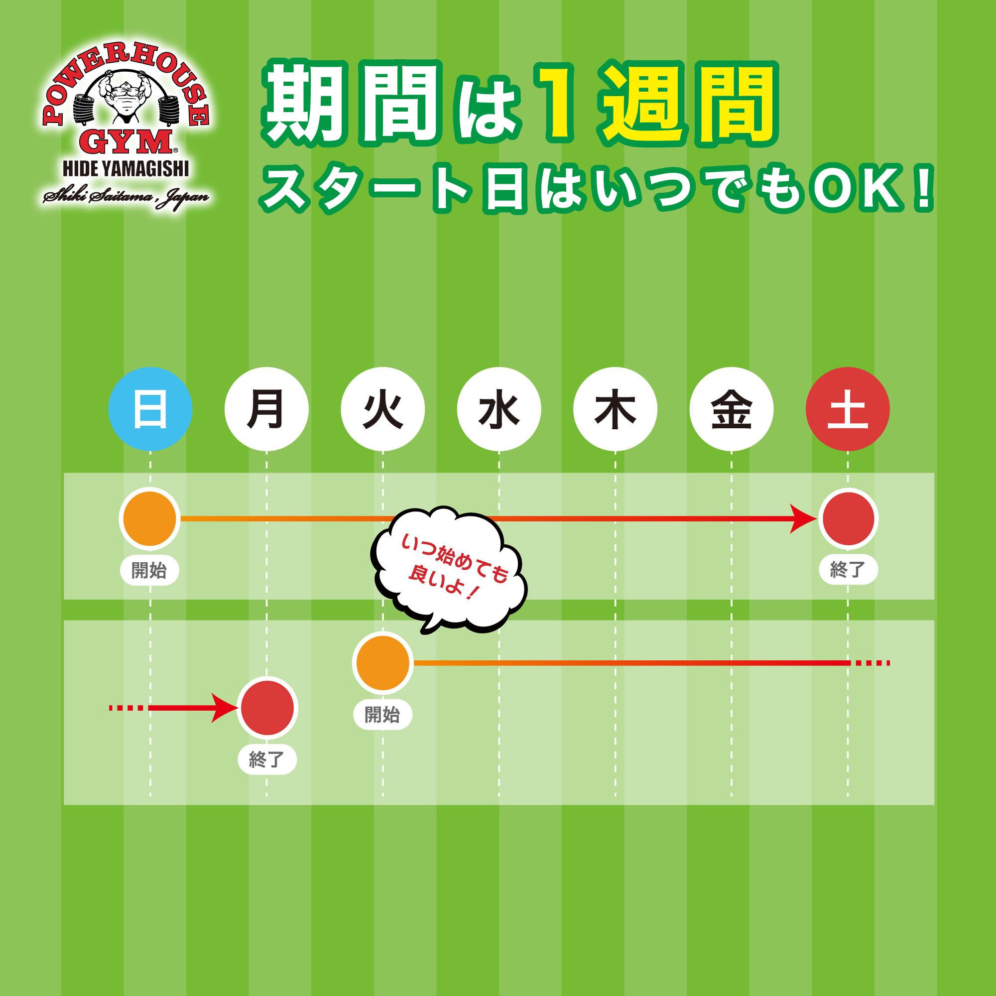 ビジター利用料金を都度お支払いしていただくのであれば、生涯一度だけご利用いただける「トライアル1ウィーク」を活用し、1週間じっくりとパワーハウスジムを堪能してみてください。